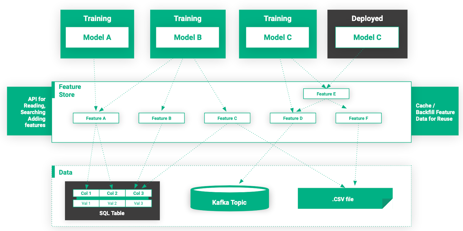 이러한 문제를 해결하기 위해 도입된게 Feature Store이다. 아래의 그림처럼 ML모델과 RawData사이에 Feature Store를 도입함으로써 이미 정의한 Feature를 재사용하고 ML모델과 RawDatat사이의 직접적인 의존성을 제거할 수 있게 되었다.