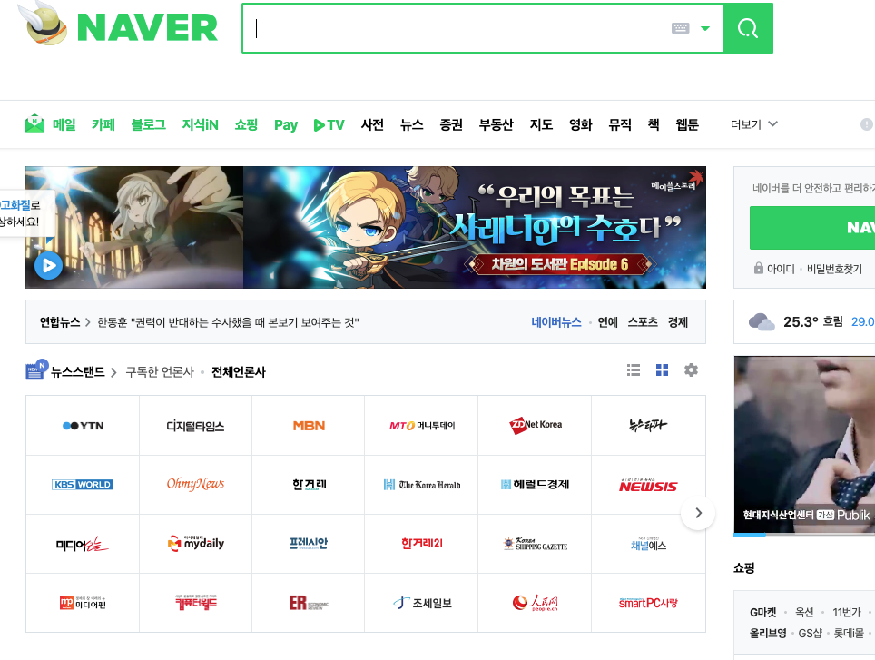 웹브라우저에서 www.naver.com으로 request를 하면 전달 받은 html, css, JS를 브라우저에서 처리하여 사용자에게 보여준다.